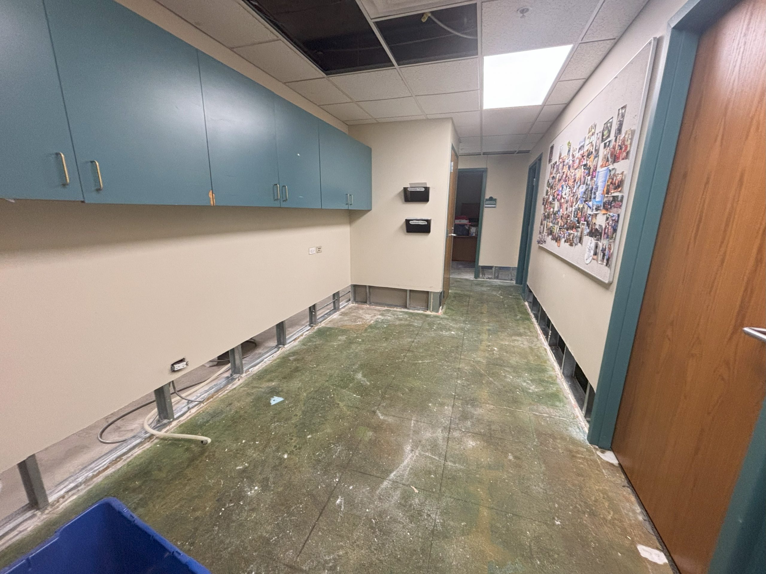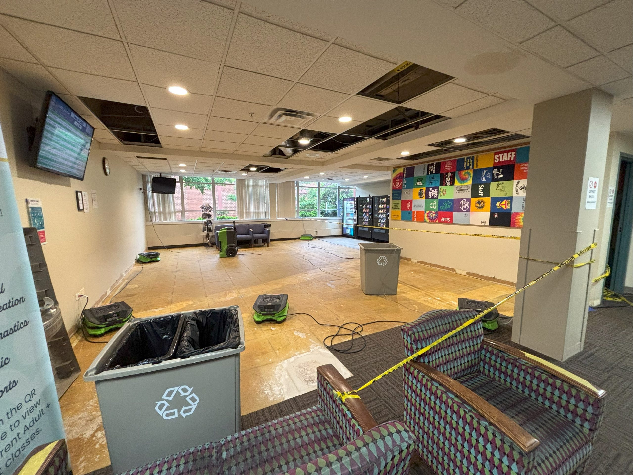 Second Floor: Several multi-purpose rooms experienced water exposure, damaging select furnishings and equipment. Flooring in various areas, including carpet and hard surfaces, is undergoing removal or drying. Specialized fitness rooms and ceramics art studios were also affected.